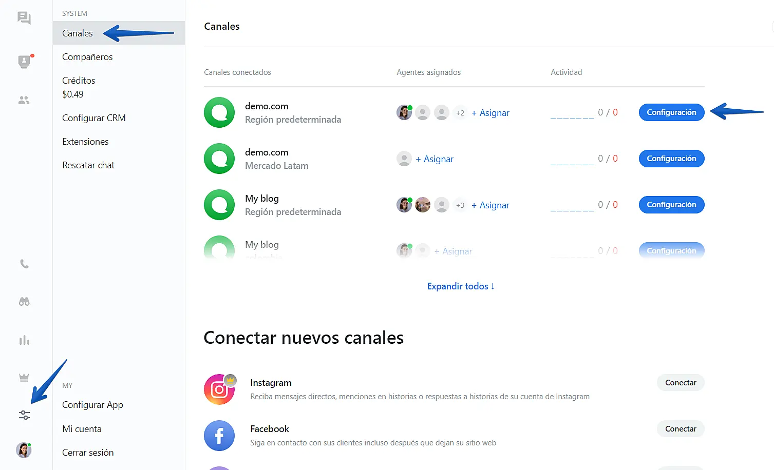 1. En la aplicación JivoChat o en la aplicación Web, haga clic en Ir a Ajustes -> Canales -> Configuración (junto al nombre del sitio web).