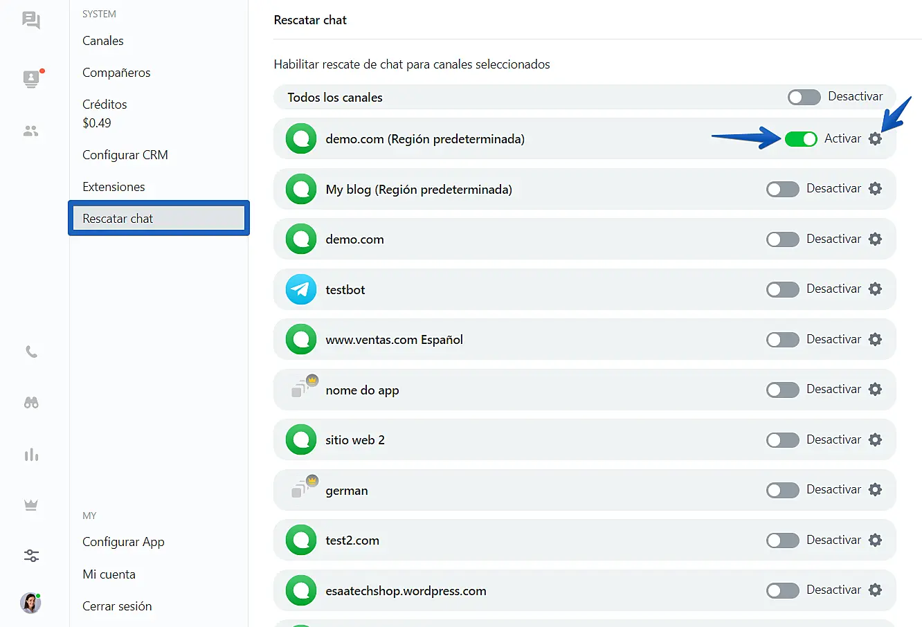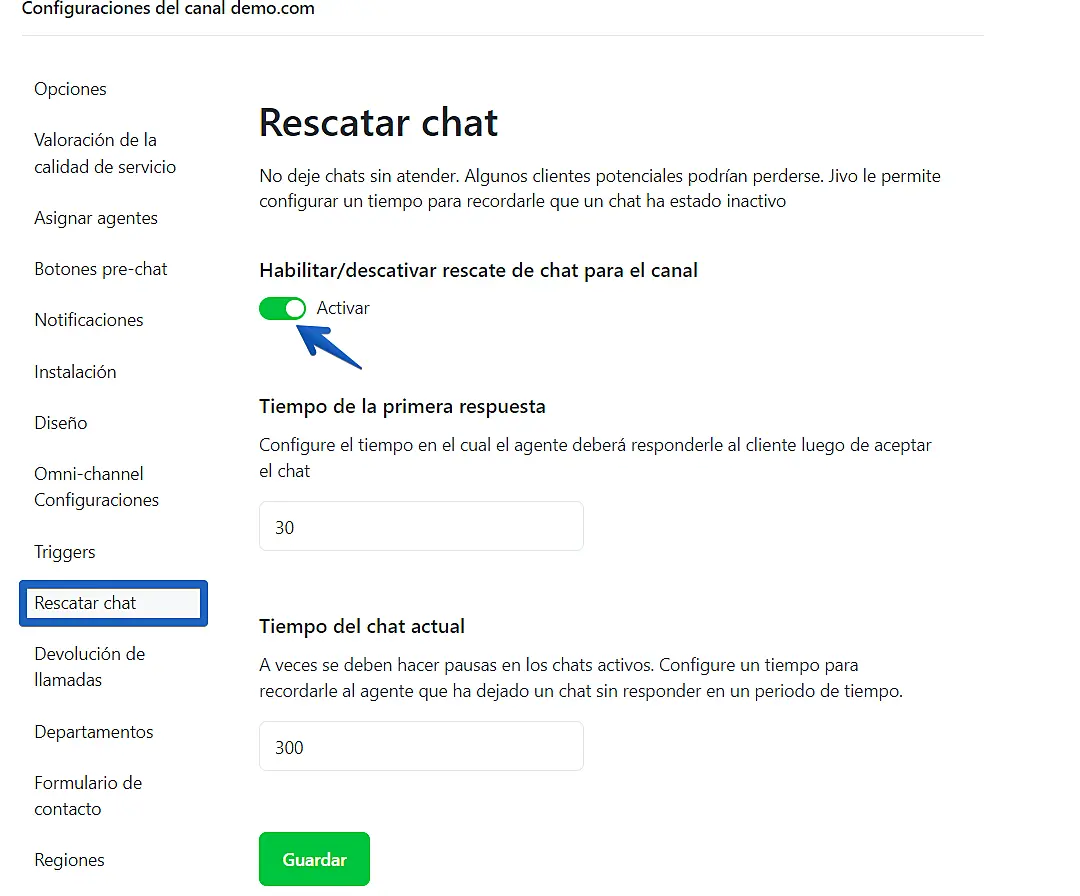 2. Seleccione Rescate de chat en la configuración del canal y active el control deslizante Activar/Desactivar rescate de chat para el canal.