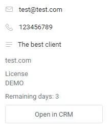 • Información de contacto completa de sus clientes / clientes potenciales si su correo electrónico o teléfono específico ya existe en el sistema JivoChat. Por ejemplo, si el visitante dio su correo electrónico durante un chat, su CRM puede responder con el nombre, número de teléfono y comentario del visitante y hacer que se complete automáticamente los campos de información de contacto de JivoChat.