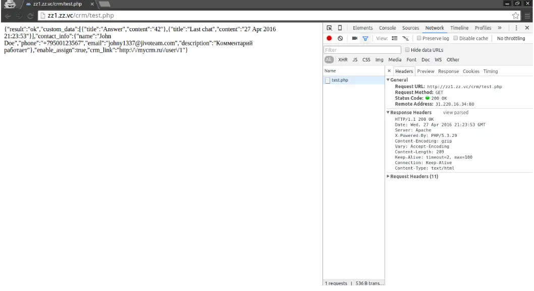 {"result":"ok","custom_data":[{"title":"Answer","content":"42"},{"title":"Last chat","content":"27 Sep 2016 19:37:12"}],"contact_info":{"name":"John Doe","phone":"+79500123567","email":"johny1337@jivoteam.com","description":"Visitor comment"},"enable_assign":true,"crm_link":"http:\/\/mycrm.ru\/user\/1"}