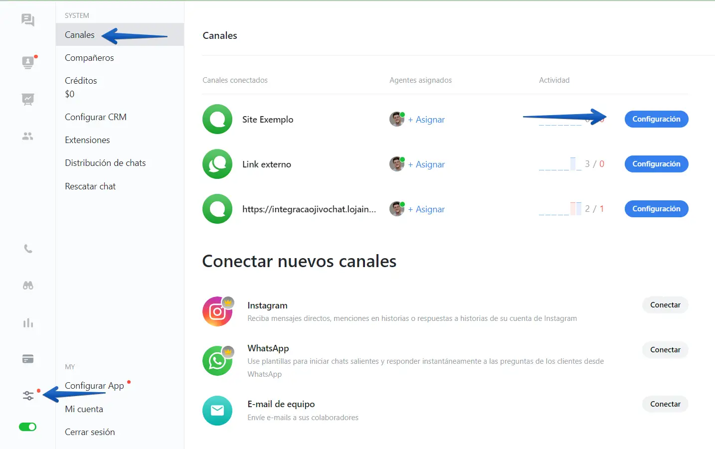 Para añadir la URL, vaya a la aplicación web de JivoChat o a la aplicación instalada en el computador. Vaya a "Ajustes"-> "Canales"-> "Configuraciones del canal" (debajo del nombre del canal):