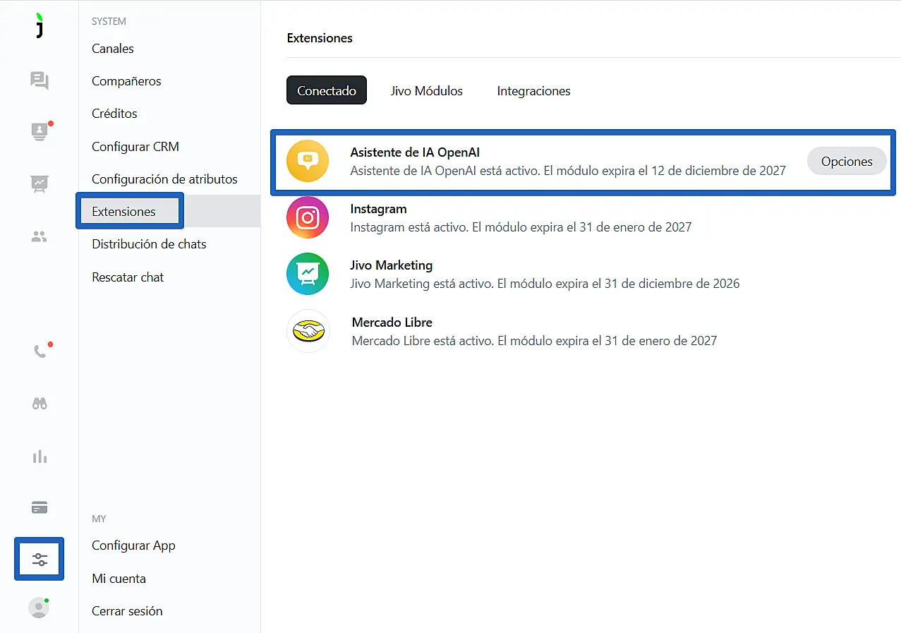 Para habilitar el copiloto automático en la aplicación de JivoChat, vaya al menú "Ajustes" -> "Extensiones" -> "Conectado" y haga clic en "opciones".