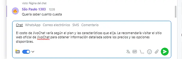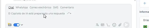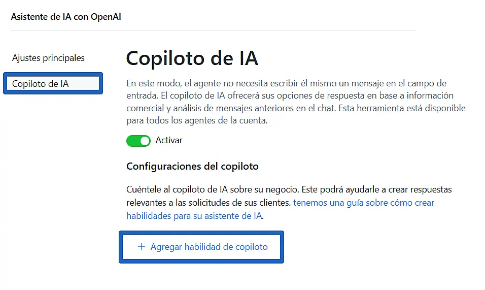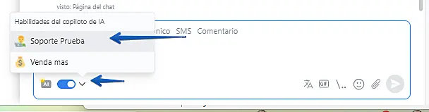 Para generar una respuesta automática en un chat, seleccione la habilidad deseada de la lista y active el interruptor "Copiloto de IA".