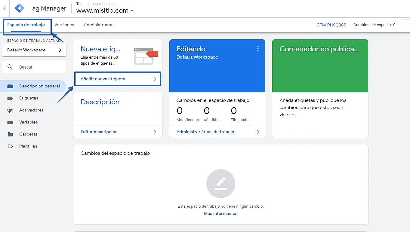 Primero debe iniciar sesión en su panel de Google Tag Manager y haga clic en "Espacio de trabajo" -> "Descripción general"-> "Añadir nueva etiqueta".