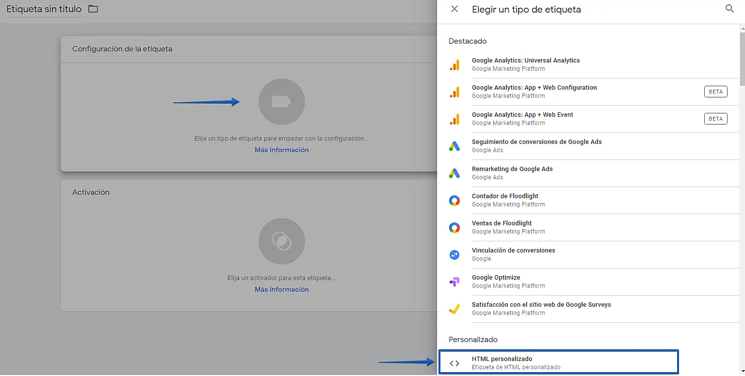 Haga clic para seleccionar el tipo de etiqueta y seleccione la opción "HTML personalizado"