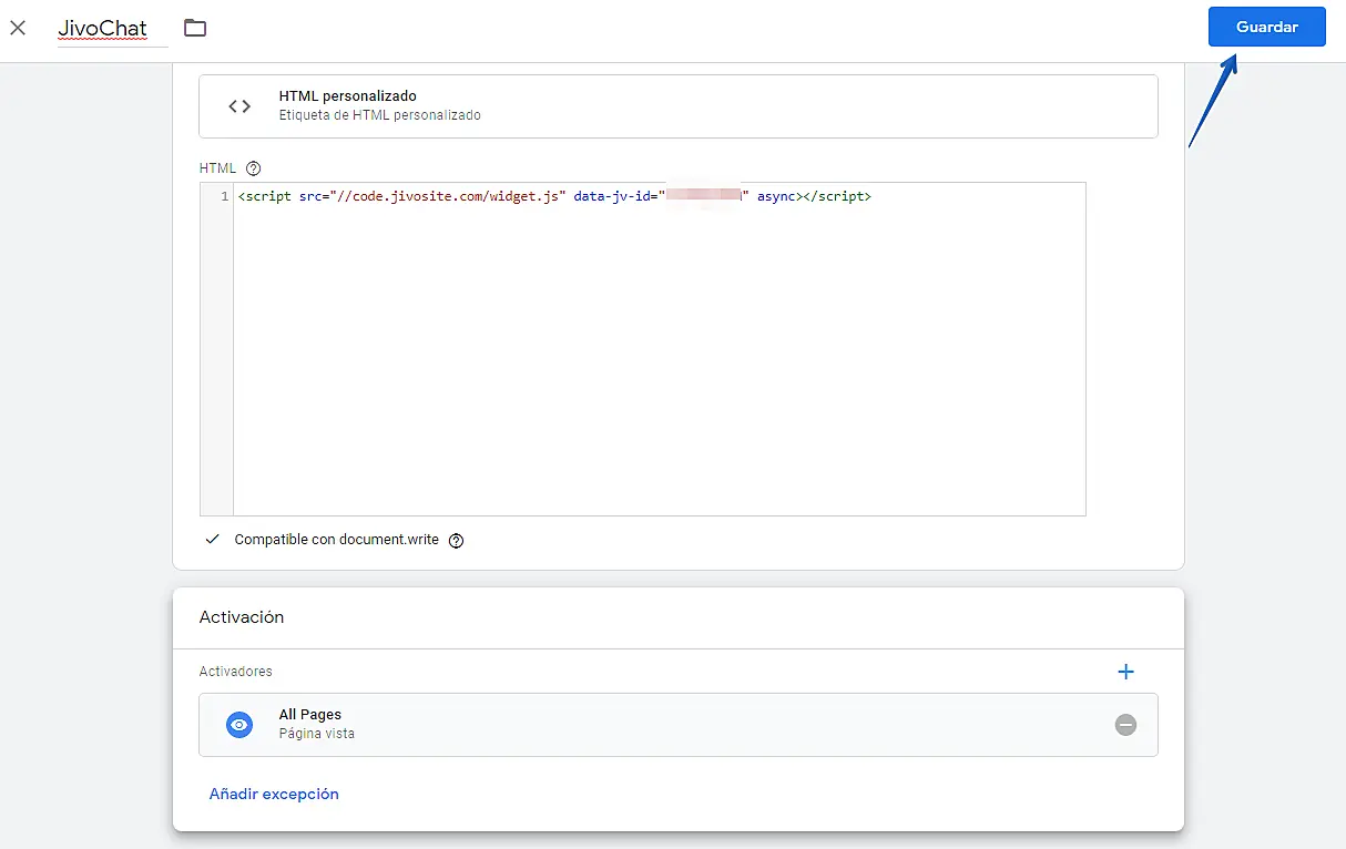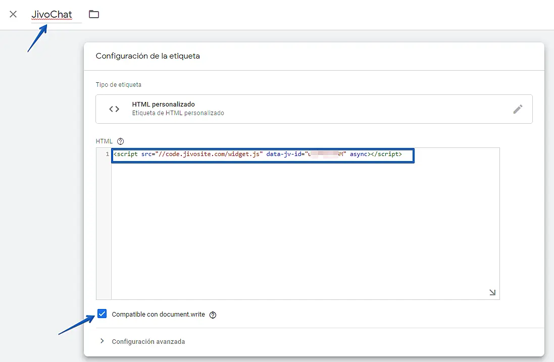 Ingrese el nombre de la etiqueta que está creando, copie el código de instalación de JivoChat en el campo "HTML" y marque la opción "Compatible con document.write "