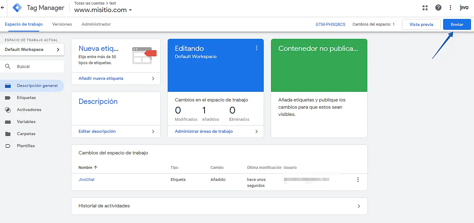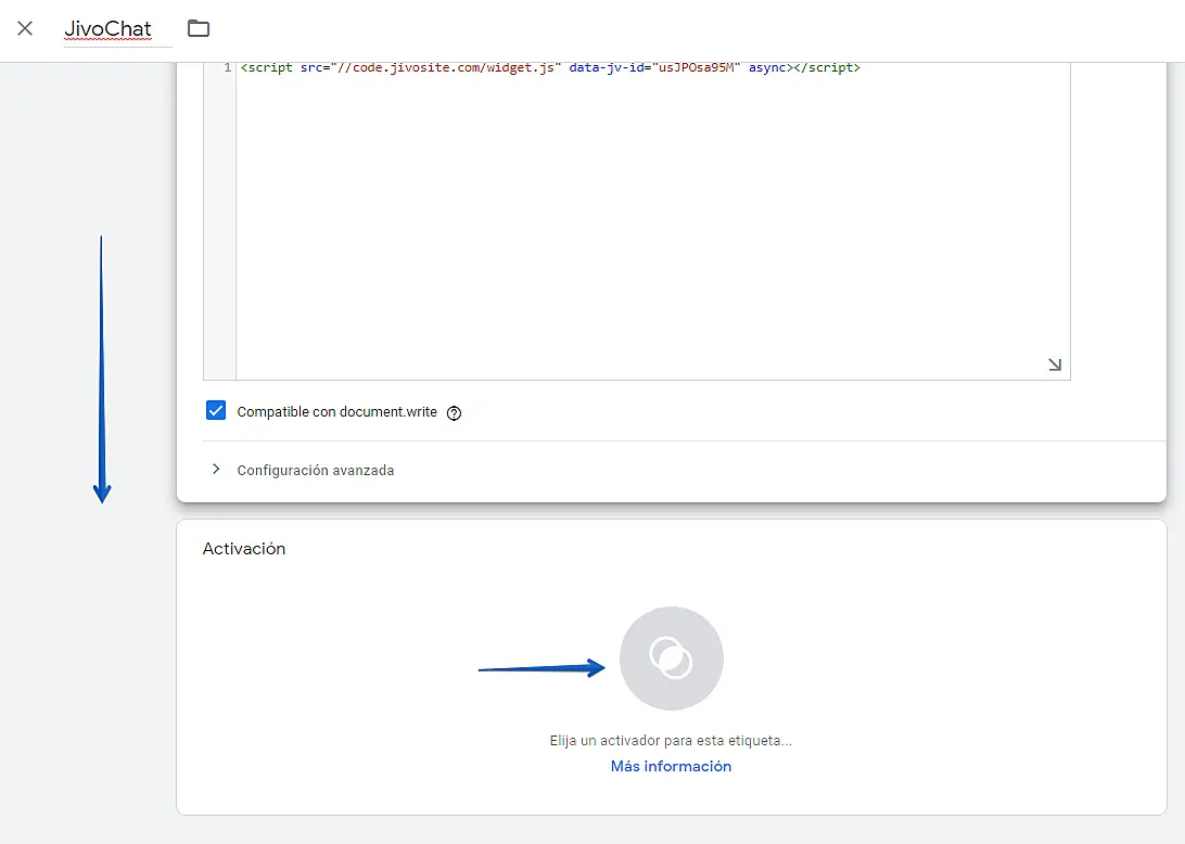 Vamos a dejar esta ventana abierta para seguir con los pasos desde JivoChat y desde google tag manager.