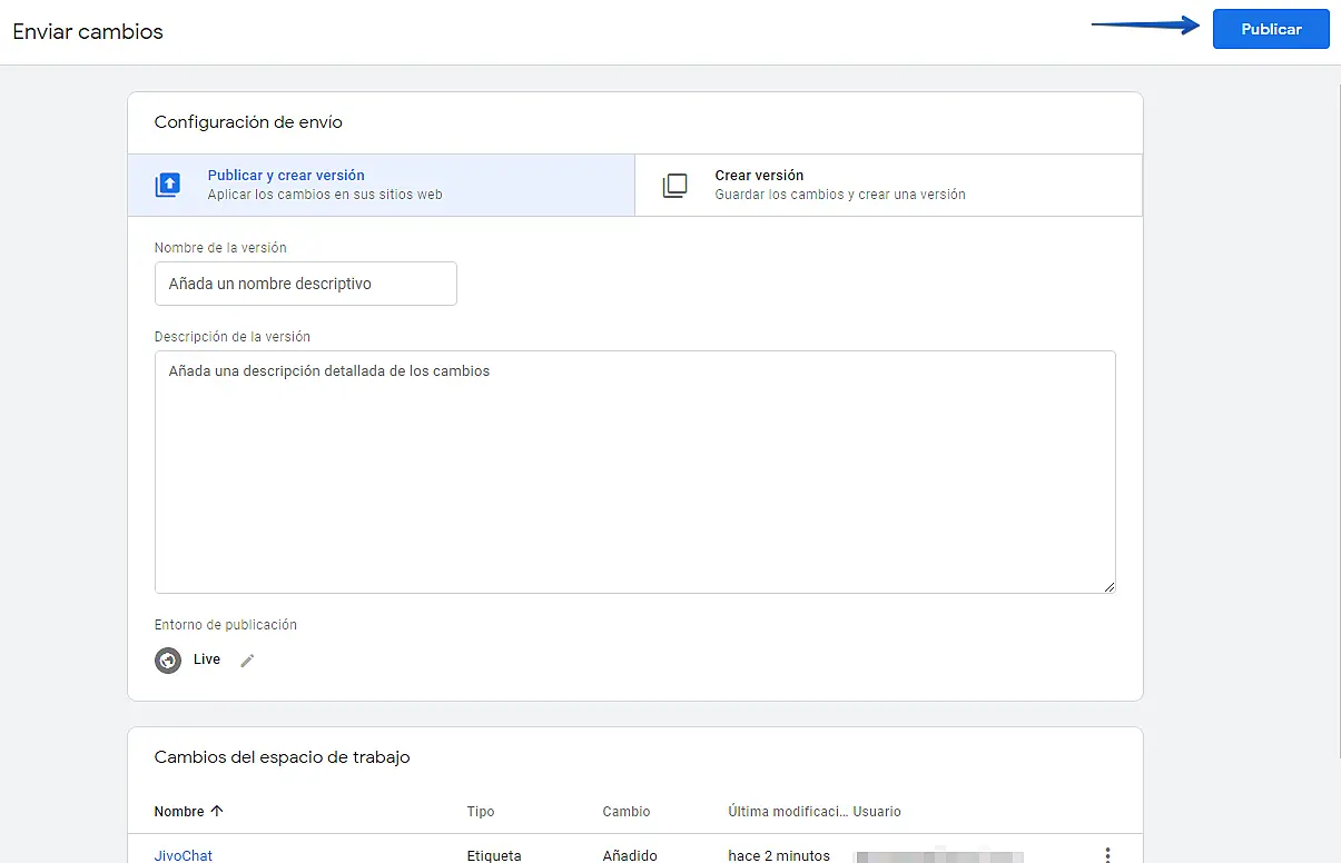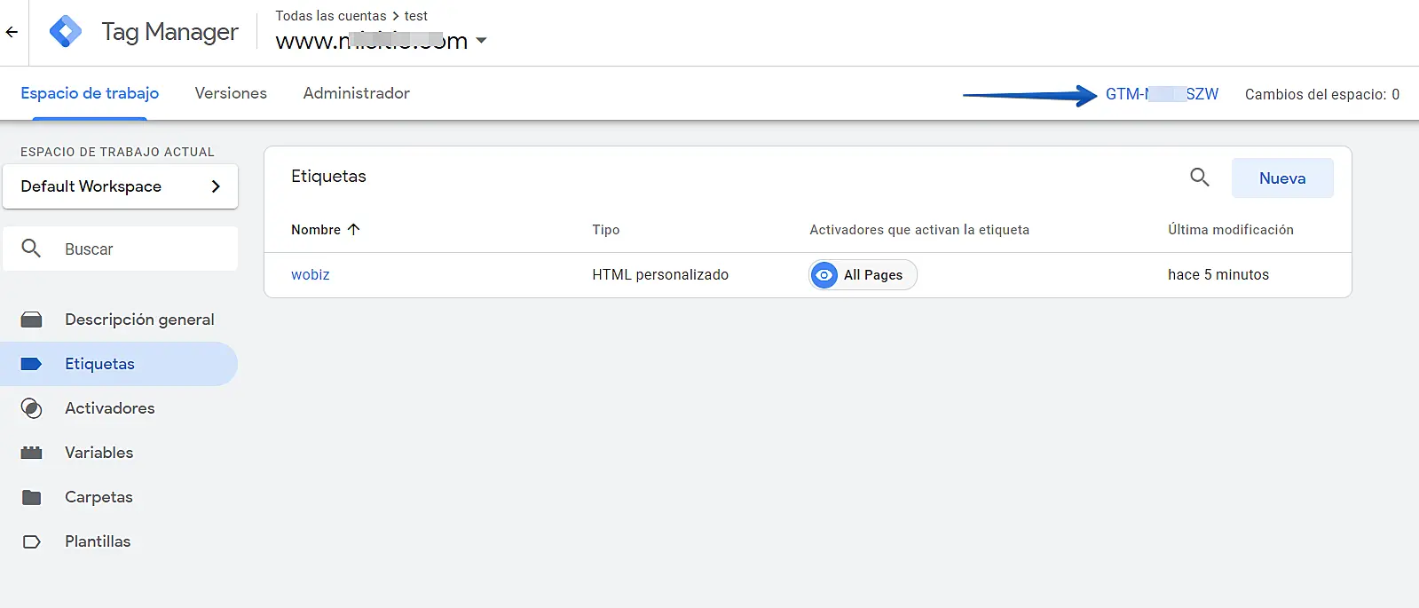 En la siguiente pantalla veremos el campo para añadir nuestro código de google tag manager