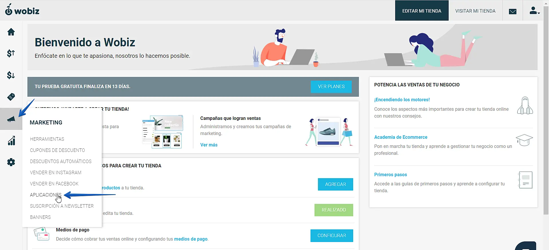 En el menú lateral izquierdo vamos a "Marketing" y hacemos clic en "Aplicaciones"