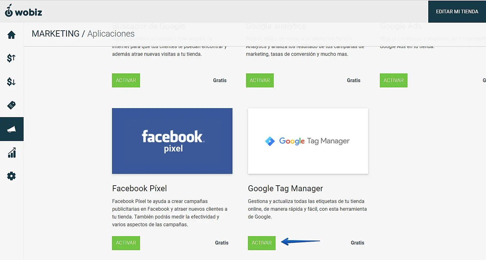 Luego vamos a "Google Tag Manager" en la lista de aplicaciones y hacemos clic en "activar"