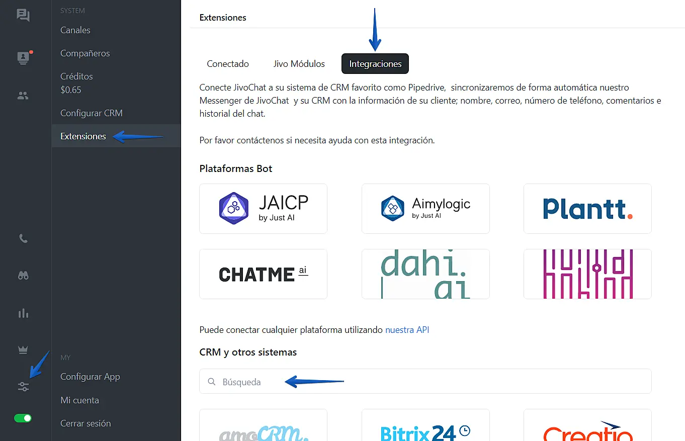 Abra la aplicación web de JivoChat o la aplicación de escritorio, vaya a Ajustes -> Extensiones ->Integraciones -> y busque Bitrix24.