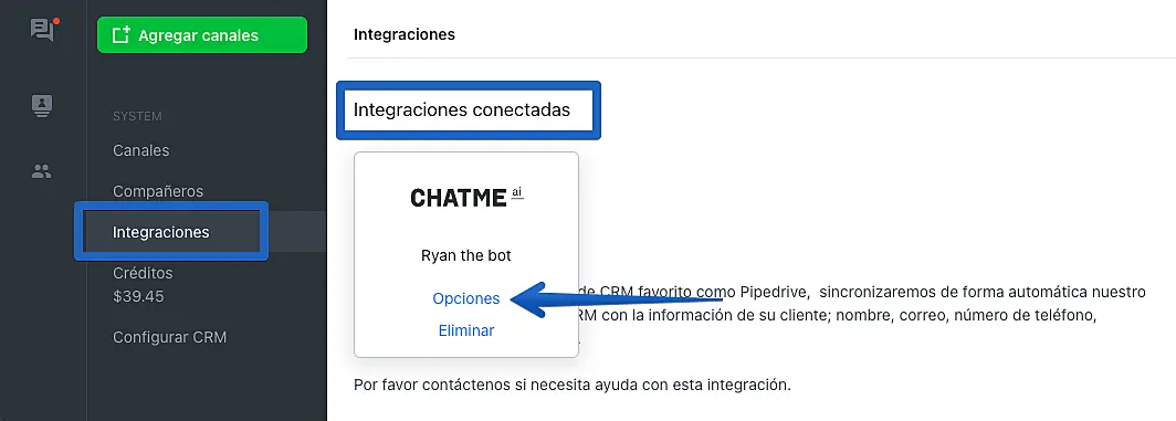 ¡La integración está completa! Verá el bot en Integraciones conectadas y puede cambiar su configuración cuando lo desee colocando el puntero del mouse sobre la integración > Opciones.