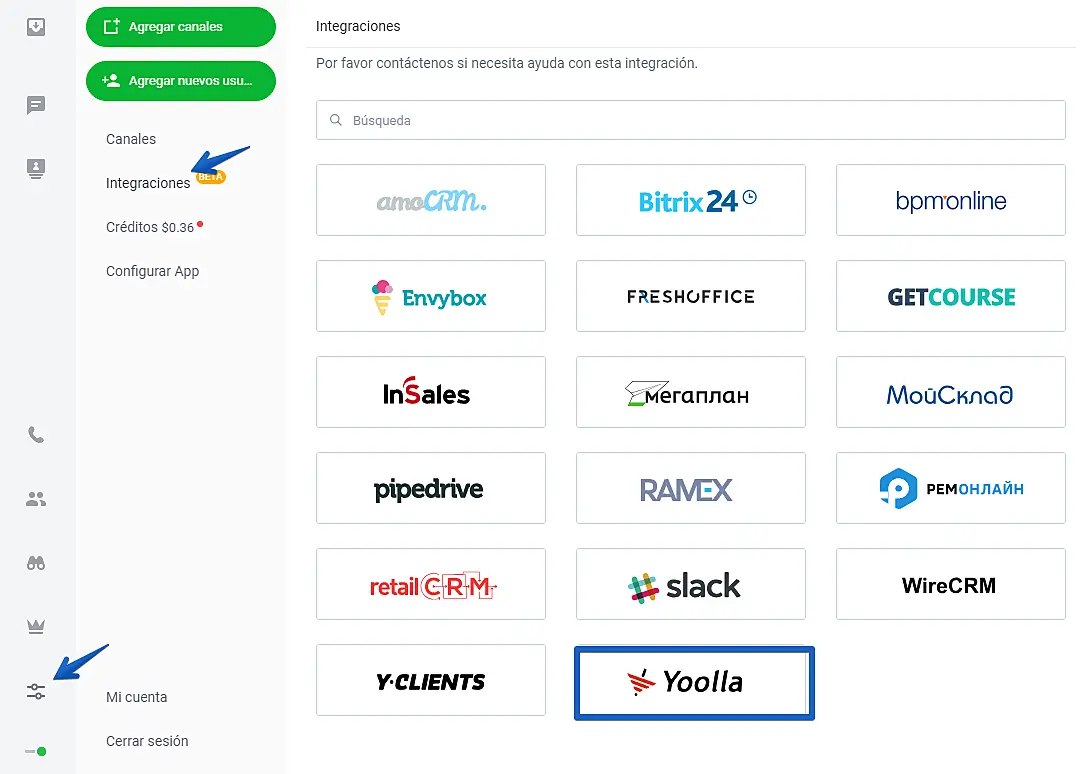 Para integrar con Yoolla, abra su Aplicación del agente y vaya a "Ajustes"-> "Integraciones" y haga clic en Yoolla.