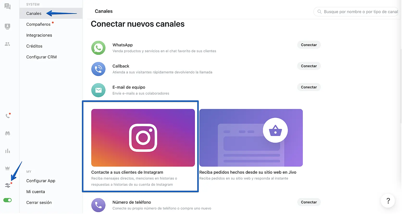 Abra nuestra Aplicación de JivoChat y vaya a "Ajustes" > "Canales":