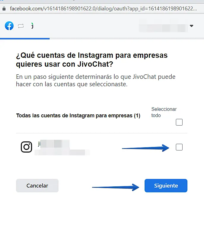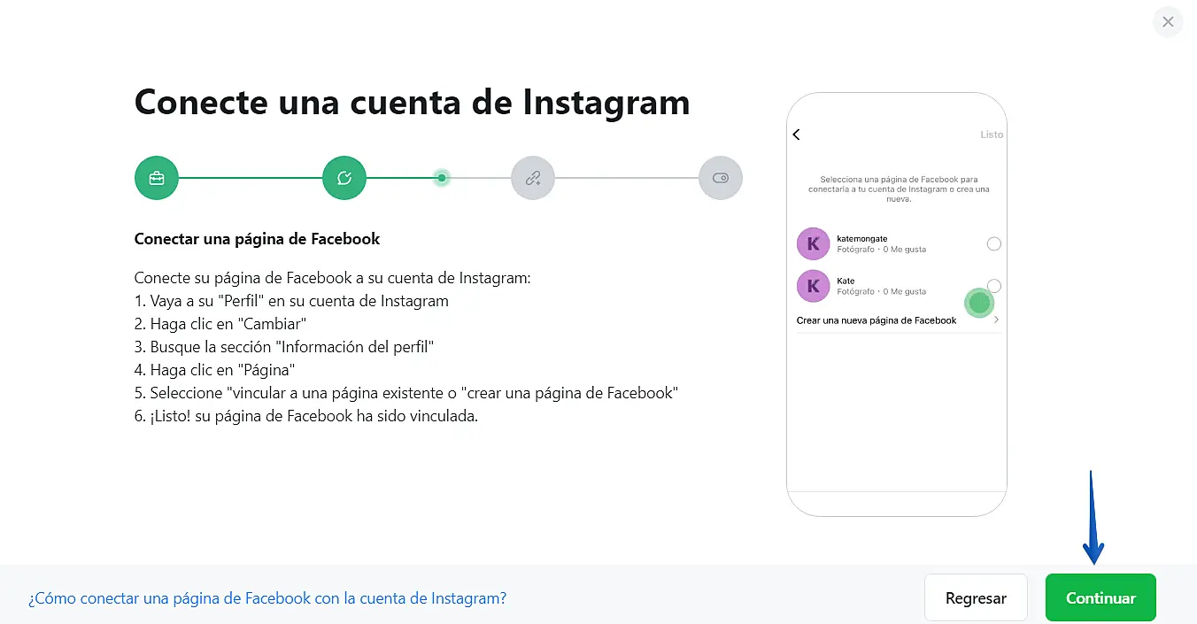 En esta pantalla deberá seleccionar la página de Instagram que quiere conectar: