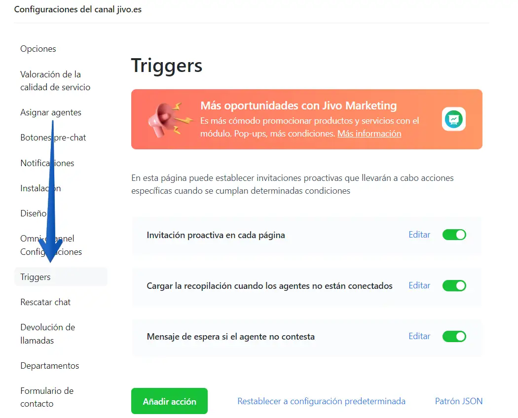 Vaya a "Ajustes"->"Canales"->"Configuraciones" (debajo del nombre de su web)-> triggers