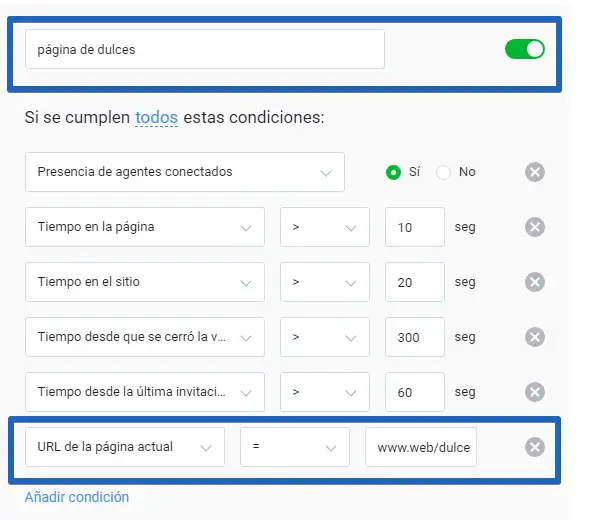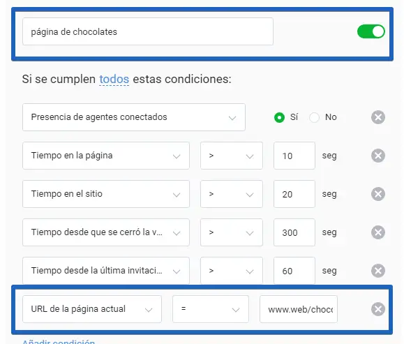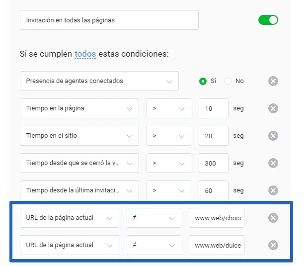 La esencia de este método es que puede crear varias reglas para invitaciones proactivas, las cuales establecerá en ciertas páginas utilizando la condición "URL de la página actual". Este método tiene un límite máximo de 10 reglas proactivas por página (no se pueden repetir). Ejemplo para dos páginas individuales