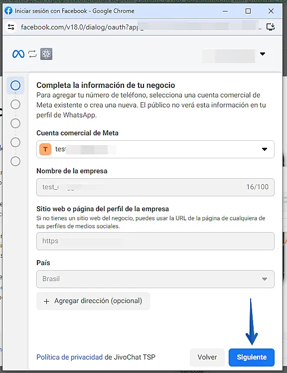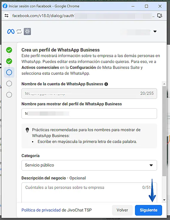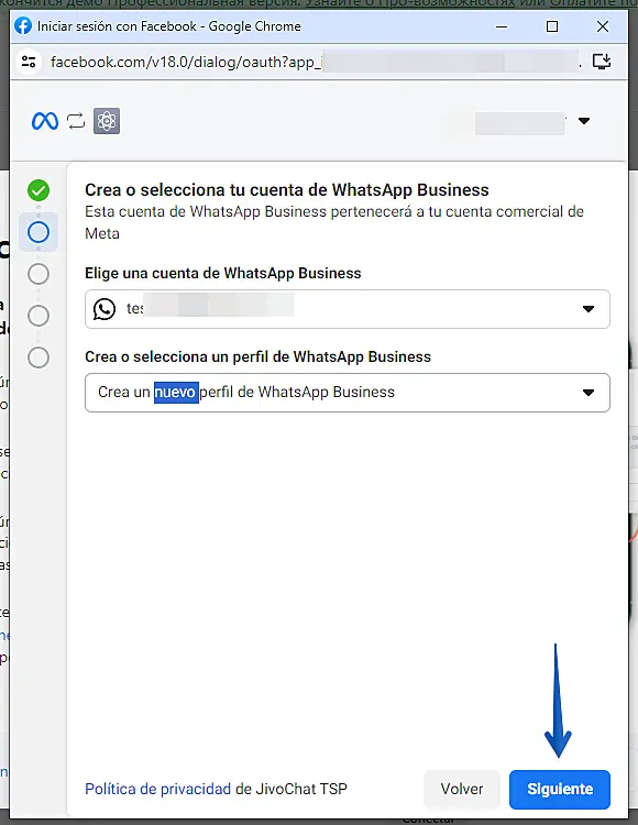 Elija una cuenta comercial de WhatsApp o cree una nueva y luego haga clic en "Siguiente"