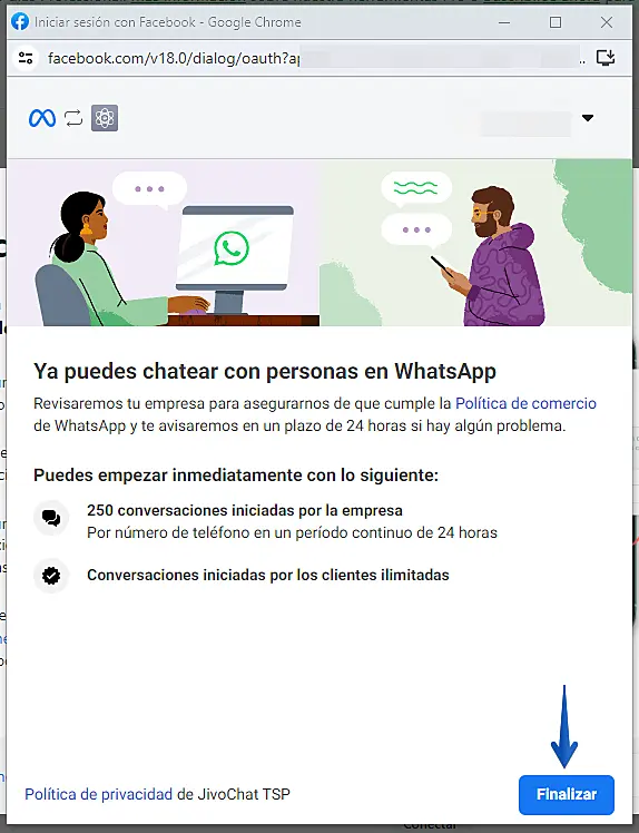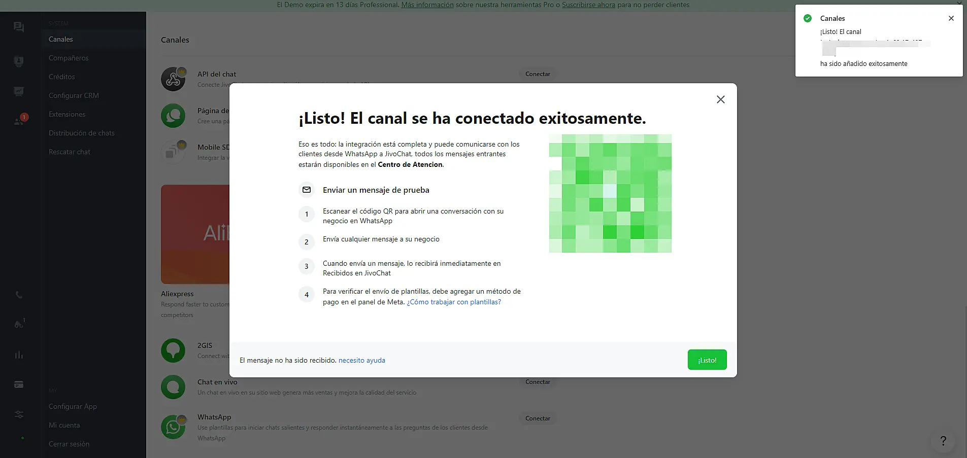 ¡Felicidades! 🎉 Ahora el número de WhatsApp ya está conectado a JivoChat