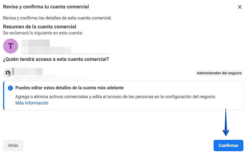 E - Revise y confirme su cuenta comercial haciendo clic en "Confirmar"